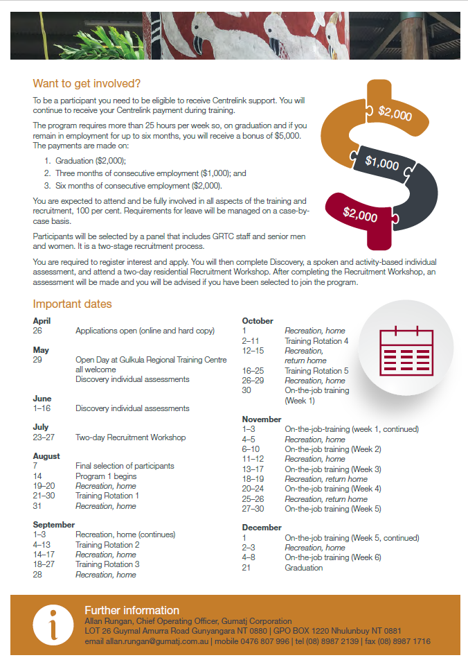 - Coordinated with Miwatj Employment and Participation to establish a GRTC Working Group